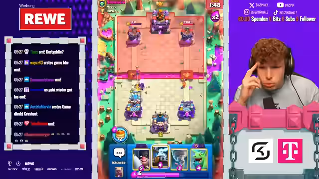 05:32:55Im weiteren Verlauf der Spiele offenbaren sich einige taktische Schwierigkeiten und Fehlentscheidungen. Der Streamer analysiert kritisch, wie er in eine "Scheren situation" geraten ist, in der einige Karten des Decks gegen den spezifischen Gegner wenig Wert haben. Er erkennt auch eigene strategische Fehler, wie eine zu aggressive Spielweise oder die verspätete Aktivierung von Karten, die in der Folge zu Nachteilen führen.