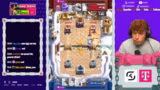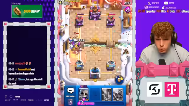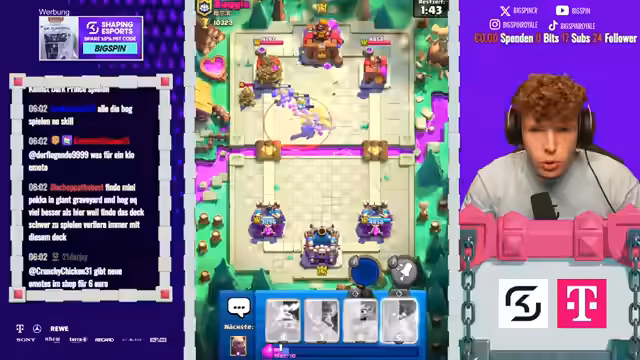 05:47:15Als der Gegner mit hohem Druck und Giant in die Offensive geht, zeigt der Streamer, wie man mit gezielten Kartenreaktionen umgeht. Durch das Platzieren eines Poison-Zaubers, gefolgt von einem Geschütz, wird der gegnerische Bowler eliminiert. Die Kombination aus Ritter, Hütte und Skeletten stabilisiert die Verteidigung und nutzt die Spielsituation aus, um dem Gegner extrem hohe Kosten für seine Aktionen aufzuzwingen.
