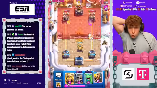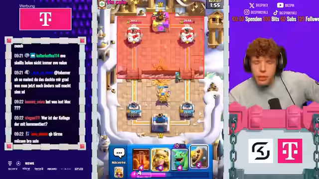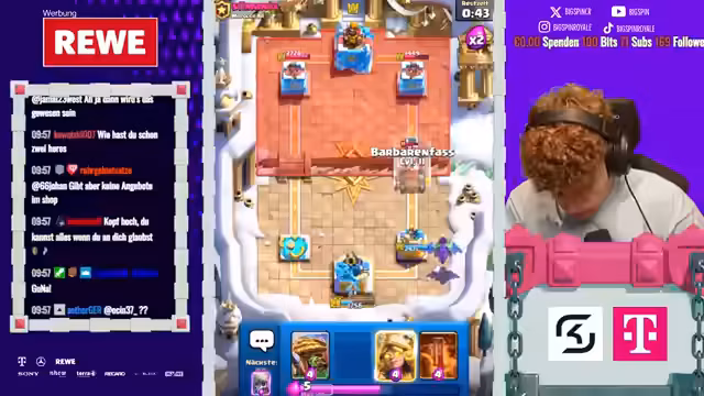 02:55:40Während des Spiels werden verschiedene Karten-Setzungen und Taktiken besprochen. Dazu gehören der Einsatz von 'Zündung' auf den Ritter als kraftvolle Defensive, die Nutzung von 'Barbell' zur Verteidigung und das Timing von 'Poison'. Es werden auch Fehler analysiert, wie eine verspätete 'Zündung', die das Spiel beeinflusst hat. Der Streamer betont die Wichtigkeit von Timing und richtigem Cycling, um in Führung zu bleiben und dem Gegner keine Chance zu geben.