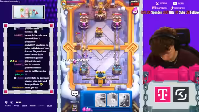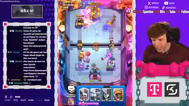 00:01:24Zu Beginn des Streams kommentiert der Streamer die aktuelle Meta und ein neues Balance-Update. Er ist begeistert vom Stream und erwähnt die neuen Trophänenmultiplikatoren ab 10.000 Trophäen. Er spielt gegen verschiedene Decks wie Goblin Giant Sparky und Hexenmutter, die er als „geistig“ und „krank“ beschreibt. Er analysiert das Matchup seiner Spirit Empress, die er als stabil, aber unterschätzt ansieht und deren defensives Potenzial er hervorhebt, während er gleichzeitig Nerfs, insbesondere an der Heilung, feststellt.
