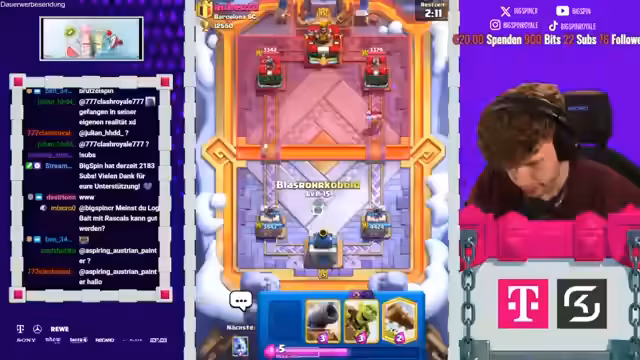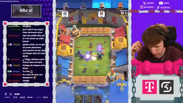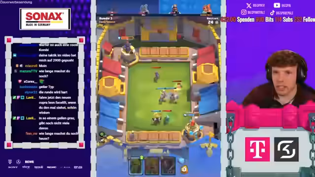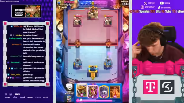 04:24:15In einem Spiel gegen ein schnelles Cycle-Deck mit Sperrkobolgen und Skellibur ist die Defense für den Streamer extrem schwierig. Der Gegner spielt schnell und persistent, was das eigene Elixiermanagement unter Druck setzt. Trotzdem gelingt es, das Game mit einem Gegenangriff zu gewinnen. Er erkannte, dass der zu frühe Einsatz der Poison ein Fehler war, der den Gegner in die Offensive drängte, und merkt an, dass ein solches Match-up sehr nervig sein kann.
