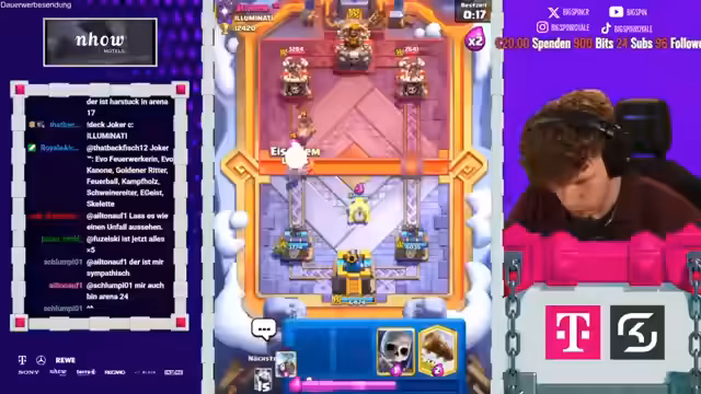 00:06:20Während des Streams werden fortgeschrittene Taktiken wie der Einsatz von Evo-Kanonen, die Nutzung der verspäteten Hoffnung (Dead Hope) und strategische Zyklen diskutiert. Der Streamer analysiert seine eigenen Fehler, wie eine suboptimale Platzierung der Evo-Hexe oder eine zu aggressive Spielweise, die ihm in den Hintern beißt. Er betont die Wichtigkeit von defensivem Spiel und der richtigen Antwort auf gegnerische Züge, die oft den Sieg entscheiden, und kritisiert, dass er seine Karten nicht optimal einsetzt.