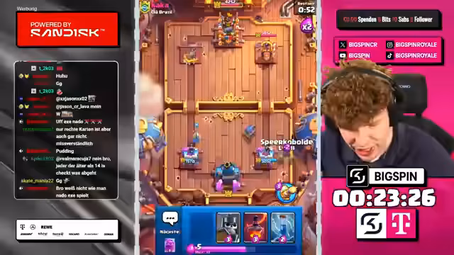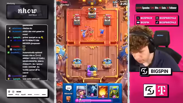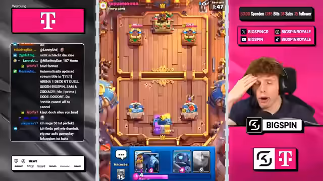 01:59:52Zur Unterhaltung und als Herausforderung startet eine interne Runde, an der Streamer Dominik, Sam, Zolik und der Haupt-Streamer teilnehmen. Jeder nutzt das gleiche, beschränkte Arena-1-Deck mit Sperrkobolden statt Bogies. Es wird ein 2v2-Modus gespielt, bei dem das Ziel ist, mehr Siege als das Gegnerteam zu erzielen. Das Ergebnis dieser Challenge hat eine humoristische Bestrafung zur Folge: Der Verlierer muss sich dem "Kogong"-Song aussetzen, was als ungleiche, aber unterhaltsame Strafe gewertet wird.