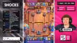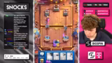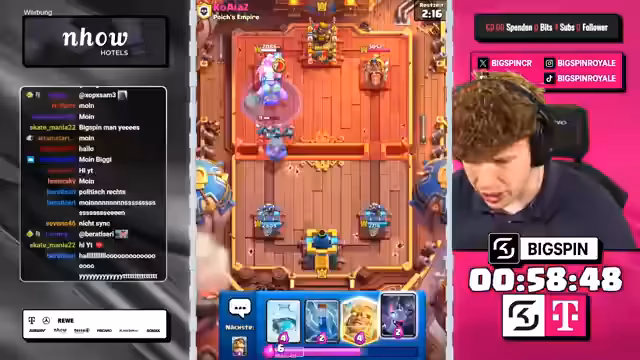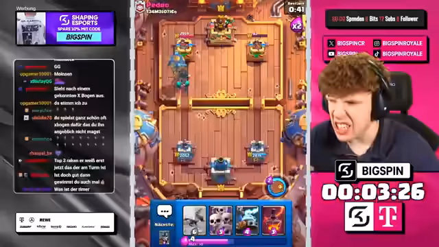 05:41:46Der Streamer setzt seine Strategum in die Tat um, indem er defensiv mit Schweinereiter und Henker agiert. Er nutzt Freeze-Karten, um aggressive Züge des Gegners wie Baby Dragon und Poison zu neutralisieren und ihm gleichzeitig Schaden zuzufügen. Der Gegner wird durch den ständigen Druck und die unkonventionellen Kartenkombinationen aus dem Takt gebracht, was dem Streamer einen klaren Vorteil verschafft und das Spiel kontrolliert zu Ende führt.