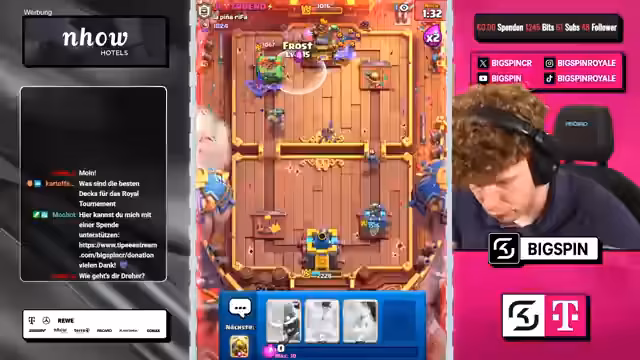 06:01:55In einem weiteren Spiel zeigt der Streamer seine Fähigkeit, die Strategie anzupassen. Gegen ein Giant-Hex-Deck wählt er einen aggressiven Ansatz, um dem Gegner keine defensive Möglichkeit zu geben. Er nutzt gezielte Freeze-Züge, um den Schaden am Turm zu maximieren und setzt auf eine 3-Kronen-Strategie. Trotz eines riskanten Spielstils gelingt es ihm, das Spiel durch konstanten Druck und clevere Zyklen für sich zu entscheiden.