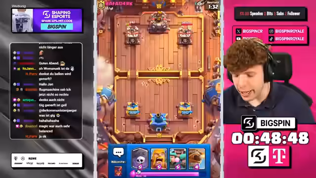 00:45:04Ein intensives Duell steht im Fokus, bei dem der Streamer durch strategische Kartenauswahl und taktische Manöver überzeugt. Der Gegner setzt auf unkonventionelle Züge, wie den Einsatz eines Holzfällers und einer Poison-Spell, was der Streamer souverän kontert. Durch gezielte Karten wie den Henker und den Ballon gelingt es, den Gegner unter Druck zu setzen und eine solide Basis für den Sieg zu schaffen. Das Spielverhalten des Gegners wird als teilweise zufällig, aber dennoch beeindruckend beschrieben, was zu einer ansprechenden Runde führt.
