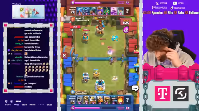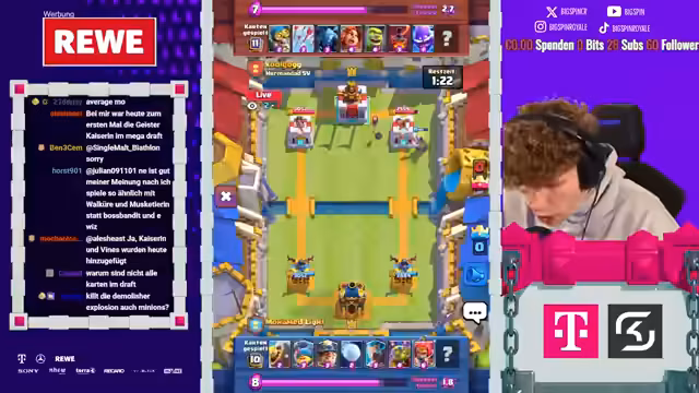 00:50:26Zu Beginn des Streams wirft der Streamer ein Goblin Barrel auf den Turm des Gegners, während der Gegner mit einem Skelly King reagiert. Daraufhin wird ein E‑Spirit eingeholt und ein Curse bereitgestellt. Der Gegner spielt stattdessen einen Magier, erhält Luftpost‑Zugaben und muss erneut gegen den Busch kämpfen. Der Streamer erklärt, dass sobald der Gegner eine offensive Magier‑Strategie nutzt, automatisch Lord Kussler und Redfeeder für einen 71‑er‑Push eingesetzt werden können. Es wird betont, wie wichtig es ist, diesen Damage zu erzielen, bevor der Gegner einen further offensiven Magier‑Push startet.