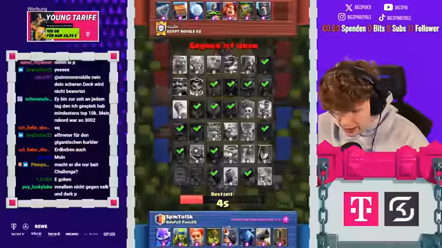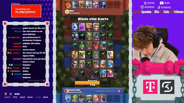 00:01:26Im Draft Teil wählt das Team bewusst nur die günstigsten Karten, um die 15-Siege-Mission zu ermöglichen. Es wird klar, dass Karten wie Berserkerin, Curse und Ice-Gas Priorität haben, weil sie im günstigen Elixier-Bereich liegen und die erforderliche Damage-Power liefern. Der Streamer erklärt, dass er die Auswahl der günstigen Zauber und die dazugehörige Strategie sorgfältig plant, um im Kampf gegen hochtrophäenreiche Gegner zu bestehen.