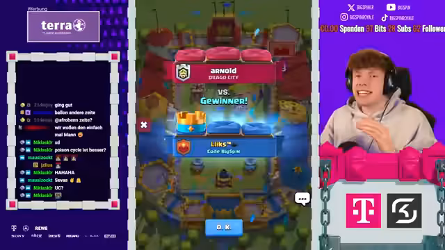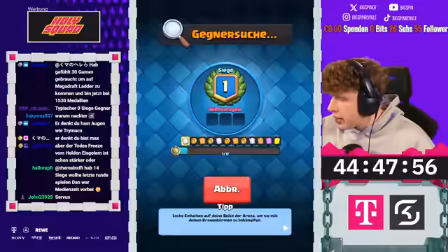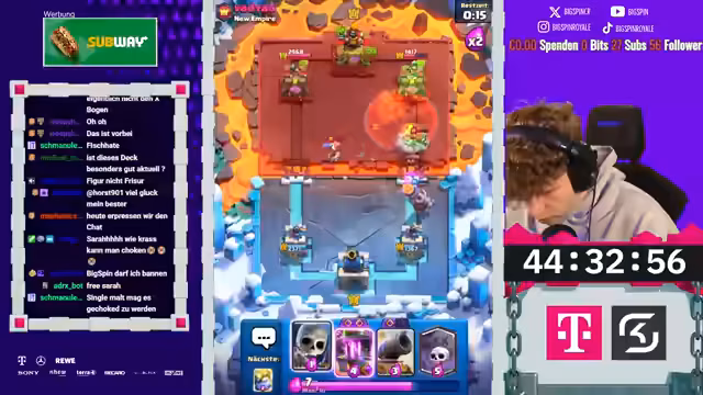 02:25:36Ab 8736-8769 startet die eigentliche Zusammenarbeit: Zuschauer werden per Discord zum gemeinsamen Deck-Picken eingeladen, der Streamer erklärt die Zusammenarbeit im Zuschauerformat und verspricht, mit ihnen gemeinsam zu gewinnen. Dabei werden verschiedene Teilnehmer namentlich angesprochen, die Möglichkeit zum Clan-Beitritt betont und das Ziel verfolgt, das Spiel gemeinsam zu optimieren.