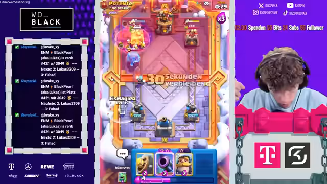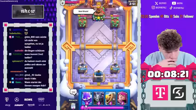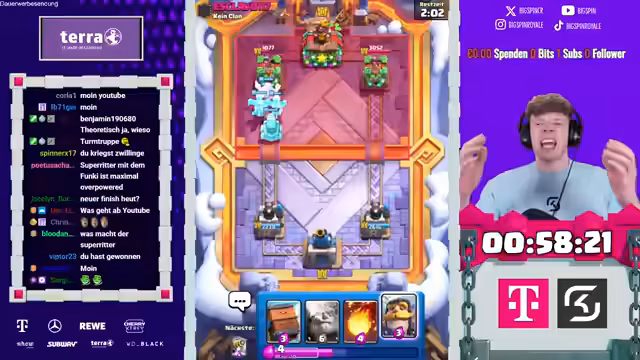 00:01:47Das Timer-Countdown-System für die Challenge wird aktiviert. bigspincr beginnt mit der ersten Runde der 'Blind Superkarten Wählen'-Challenge. Dabei wählt er zufällig Karten aus, ohne deren Identität zu kennen. Die erste Wahl offenbart eine hervorragende Kombination: den 'Superritter' und den normalen Ritter, was einen perfekten Start in das Match darstellt und den Streamer und Chat sehr begeistert.
