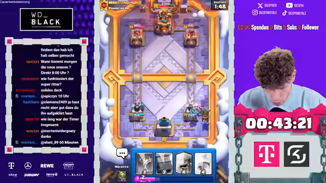 00:41:15Der Streamer wählt den Super-Pennin-Wecker und analysiert das Spiel seines Gegners Kalitos, der den Super-Eis-Golem einsetzt. Er kommentiert die potenziellen Probleme, die der Gegner haben könnte, und den möglichen Einsatz des Wutzaubers. Der Streamer bemerkt, dass der TikTok-Support stärker ist als erwartet und setzt den Mortar strategisch ein. Er äußert Zweifel an der Strategie des Gegners, der keinen Pass Royal besitzt und schließlich aufgibt, was dem Streamer einen weiteren Sieg beschert. Der Streamer wechselt zu einem anderen Account und setzt die Challenge fort, wobei er verschiedene Karten auswählt und die Superarchers erhält. Er kommentiert die rentnerartige Spielweise seines Gegners und freut sich über weitere Unterstützung. Der Streamer analysiert die Züge des Gegners, der einen Inferno-Turm einsetzt, und äußert seine Verwunderung über dessen unkonventionelle Strategie.