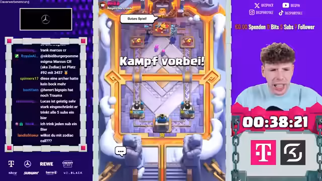 00:40:27Nach dem erfolgreichen Abschluss der 'Blind Superkarten Wählen'-Challenge wechselt bigspincr zu einem zweiten Account, der noch nicht an der Challenge teilgenommen hat, um dort das 'Season End Finale' fortzusetzen. Er beginnt erneut mit dem zufälligen Wählen von Karten und startet direkt ins nächste Match, wobei er von den Zuschauern massiv unterstützt wird.