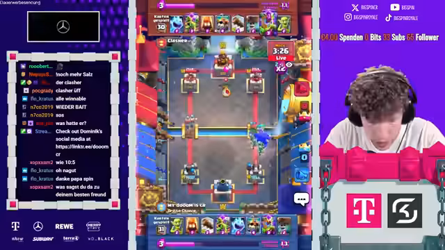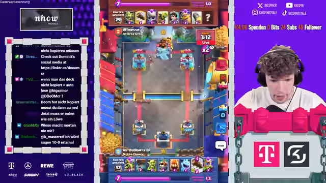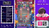 01:45:00Der Streamer zeigt sich frustriert über die Spielweise eines Kontrahenten, der mit „Grave“ (Grab-Deck) spielt, und kritisiert dessen Entscheidung, „Inferno“ statt einer anderen Karte zu spielen. Er zweifelt stark an der Taktik, da diese ihm zufolge gar nicht zu passen scheint. Währenddessen wird der „King Tower“ im Spiel aktiviert, was den Streamer jedoch nicht weiter zu stören scheint, da es seiner Meinung nach Teil des Spiels ist, den Gegner zu nerven.