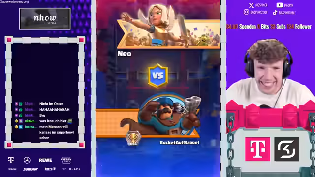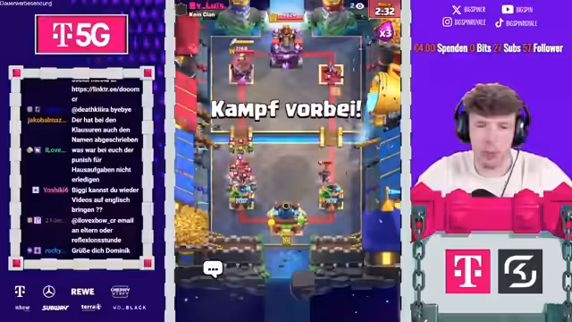 03:12:52Zu Beginn des Stream-Ausschnitts zeigt große Aufregung über das Ausscheiden beider Gegner, 'Deckers', und fordert Einsicht ein. Er preist die Nostalgie von 'Giddy's' und kritisiert das 'Spell-Cycle'-Deck des Gegners. Im Gameplay wird ein '68er Finish' thematisiert, wobei GT-Finishes nicht anerkannt werden. Es wird die Verteidigung mit einem 'Pekka' besprochen und die Notwendigkeit einer guten Positionierung betont, um 'Thermodacken' zu schützen.