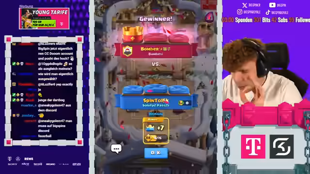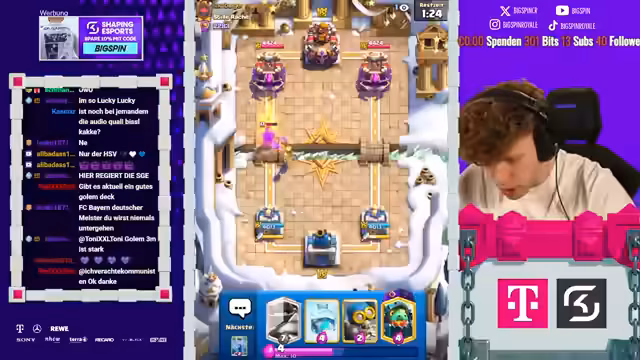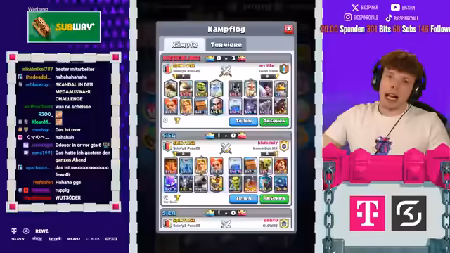01:39:52Nach dem Verlust bittet der Streamer 'Gummy-Giraffe' um Hilfe und interagiert mit Tim, der als 'Bruno02' am Start ist. Tim stellt sich als 17-jähriger Spieler aus Eidenheim vor. Der Streamer erklärt die Regeln (schnelleres Karten-Picken) und wählt mit ihm gemeinsam ein neues Deck: Infernus, Berserkerin, Miner und Drill (Poison-Kanone). Die Deck-Auswahl wird als 'interessant' bewertet, während der Streamer Tim als 'Bruno' bezeichnet.
