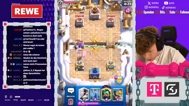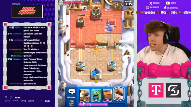 04:14:16In der frühen Phase des Streams diskutiert der Spieler taktische Manöver wie den Einsatz von Barrel und Hexenmutter, während er den Gegner analysiert und sich über dessen unerwartete Züge mit Eisgeist ärgert. Die Szene zeigt ein intensives card-playing mit Fokus auf Ressourcenmanagement und Positionsmanagement, wobei versucht wird, den gegnerischen Turm zu brechen. Es gibt Verwunderung über den plötzlichen Verlust des eigenen Turms, was zu einer hitzigen Reflexion über die Spielmechaniken führt. Die Runde endet mit einem Sieg gegen einen scheinbar überfordernden Gegner, was zu einer kurzen Unterbrechung für eine Ankündigung führt.