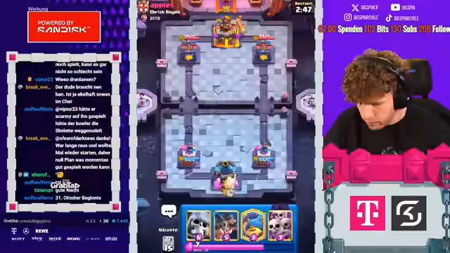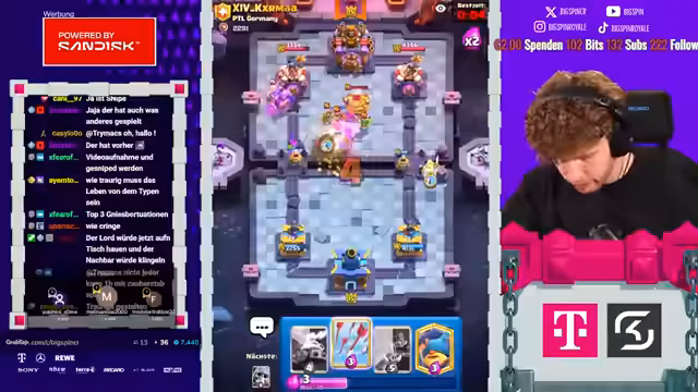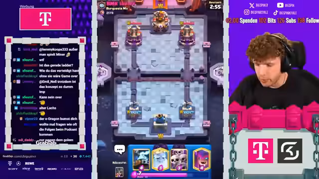 03:08:27Ein Match gegen ein identisches Deck bringt besondere taktische Herausforderungen. Der Gegner spielt ebenfalls Giant Skelly und Royal Hogs. Der Streamer muss die richtige Balance finden, um nicht durch gegnerische Antworten wie Tornado oder Pfeile überlistet zu werden. Nach anfänglichen Unsicherheiten und falschen Platzierungen von Truppen nutzt er eine opportunistische Skamy-Brücke, um einen Turm zu sichern. Obwohl er sich selbst spielt 'wie ein Depp', gewinnt er das Game, was seine anfängliche Verwirrung über die Stärke des Decks nur unterstreicht.