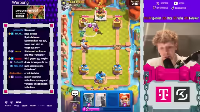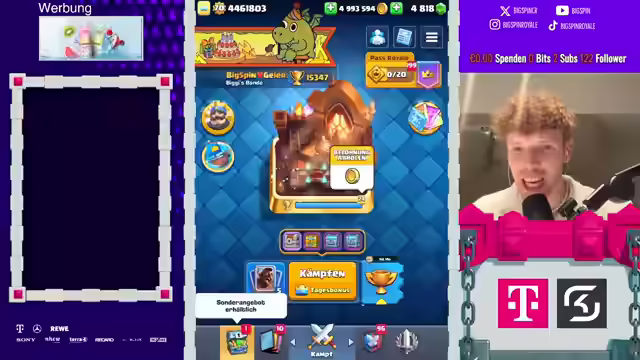 01:42:45Der Streamer äußert seinen Unmut darüber, gegen einen X-Bogen spielen zu müssen, insbesondere mit einer Luftpost im Deck. Er beschreibt die Situation als "größten Wutköder unter der Sonne". Trotz der Schwierigkeiten gewinnt er das Spiel, was er als "absolutes Verbrechen" bezeichnet. Nach dem Spiel wechselt er zum F2P- und Pass-Account, um Belohnungen einzusammeln. Er öffnet Clan-Reise-Belohnungen und freut sich darauf, bald eine dritte Karte auf maximales Level zu bringen. Er hofft auf einen "Lucky Job" und öffnet Kisten, wobei er sich über fehlende Koch-Freischaltungen ärgert. Anschließend geht es mit einigen Kämpfen weiter.