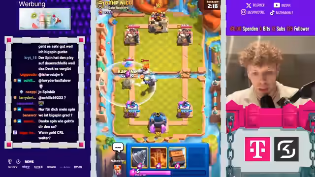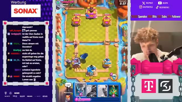 01:29:06Zu Beginn der Aufzeichnung analysiert der Streamer sein Gegner-Deck, das aus Karten wie Hexer, Barbell und Eismagier besteht. Er entscheidet sich defensiv zu spielen und setzt Karten wie Vines und Barbell ein, um Druck auf den gegnerischen Turm auszuüben. Beim Gegner beobachtet er eine Golem-Maschine, was ihn zu einem strategischen Wechsel bewegt. Er identifiziert eine freie Verteidigungsmöglichkeit und plant, den Ofen zu platzieren, während er den Spirit als starke Karte ansieht. Das folgende Spiel wird als ausgeglichen und strategisch wertvoll beschrieben, wobei der Gegner nach einem Baby-Deckwechsel defensiv bleibt.