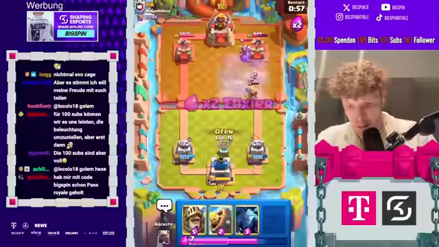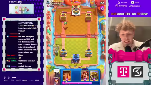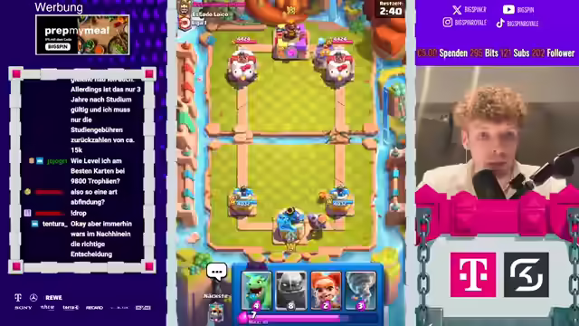 00:39:16Der Streamer kommentiert sein Aussehen, das durch ungünstige Lichtverhältnisse beeinflusst wird. Er spielt eine Prinzessin an der Brücke, auf die der Gegner mit einer Walküre reagiert. Der Gegner spielt einen Friedhof, was eine große Herausforderung darstellt. Der Streamer hat viele Antworten gegen den Ofen, muss aber einen Infernoturm in den Ofen spielen, was als dämlich empfunden wird. Er hat Probleme gegen fast alle Einheiten des Gegners. Eine Prinzessin wird gespielt, die jedoch nicht optimal ist, da der Gegner Ranken einsetzt. Das Spiel gestaltet sich als zermürbend, da der Gegner scheinbar nur das spielen muss, was er ohnehin spielt. Der Streamer befürchtet, auf Granit zu beißen. Eine Walküre wird platziert, und es wird bedauert, den Dart Goblin nicht ausgespielt zu haben. Eine Koboldhütte wird vom Gegner platziert, was die Situation verkompliziert. Der Streamer hat kein Support für das Evolution-Barbarenfass und muss es durchlaufen lassen. Ein Infernoturm wird platziert, und es wird gehofft, dass der Spirit hilft. Eine Prinzessin wird platziert, und der Gegner kontert mit Ranken. Es gibt ein Problem im Match, da der benötigte Crasher nicht auf die Straße gebracht werden kann. Eine Goblin-Gang wird platziert, die jedoch schlecht gegen den Ofen ist. Der Gegner spielt eine Version mit dem Ofen, gegen die der Streamer schlecht aufgestellt ist.