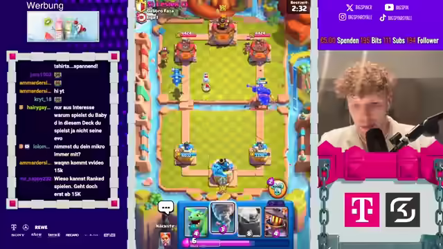 01:49:09Der Streamer analysiert die Züge des Gegners und kontert mit Ofen und Baby Dragon. Er spricht über das Boosten von Weins und das Einpacken von Pfeilen. Es folgen weitere Spiele, in denen er strategische Entscheidungen trifft und auf die Aktionen des Gegners reagiert. Er äußert sich frustriert über einen Gegner, der "gut gespielt" schreibt, obwohl er selbst full-maxed ist. Der Streamer spricht über die Herausforderungen in Liga 1 und die Schwierigkeit, gegen full-maxed Gegner zu spielen. Er kündigt ein Video an, in dem gezeigt wird, wie er die 15k erreicht hat. Er erklärt, wie er sein iPad per Kabel auf sein MacBook mirrorn kann, was ihm das Setup erleichtert. Zum Schluss spricht er über die Wahl der richtigen Evolution und die Stärke des Baby Dragons in höheren Ligen, da Gegner dessen Spielweise nicht so gut verteidigen können.