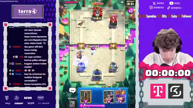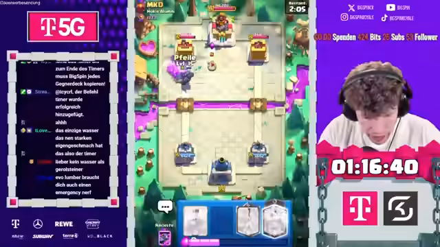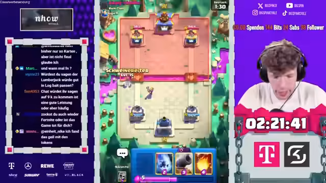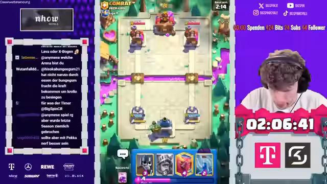 01:43:22Gegen ein Triple-Spell-Deck des Gegners gelingt dem Streamer ein klarer Sieg. Der Schlüssel zum Erfolg ist der gezielte Einsatz von Musketieren. Durch das Binden des Gegners an eine einzige Lane kann der Streamer dort massiven Schaden anrichten. Der Gegner zeigt große Probleme gegen diese Strategie und kann die Angriffe nicht effektiv verteidigen, was zu einem 'sehr, sehr geclasheden' und schönen Sieg führt.