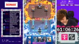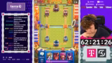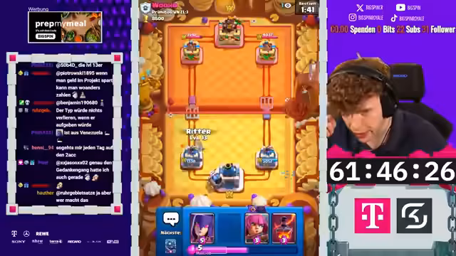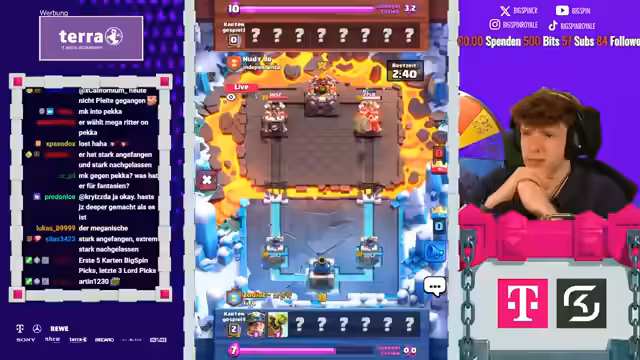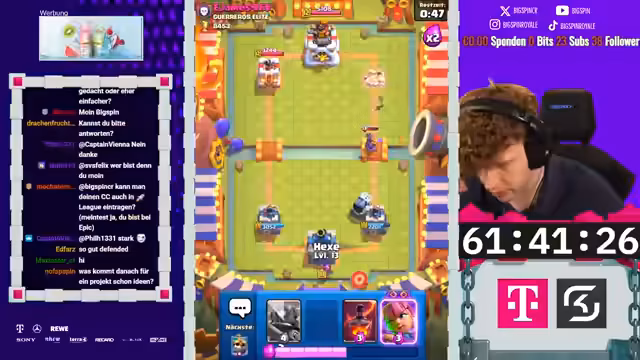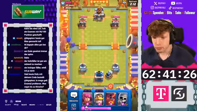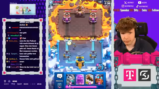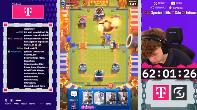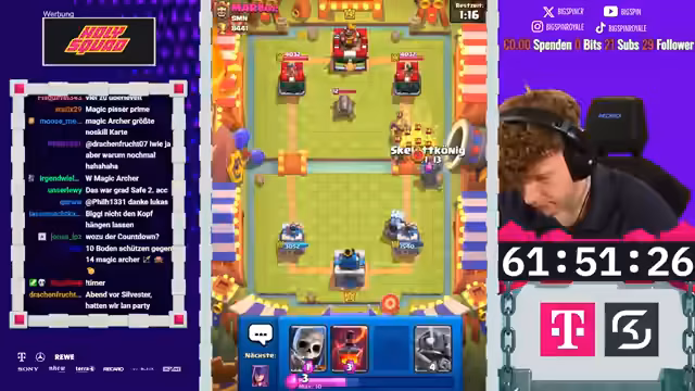 02:58:10Während der Matches kommentiert der Streamer live die Aktionen auf dem Bildschirm. Er bewundert gegnerische Spielzüge wie die Nutzung des X-Bogens, kritisiert aber auch fehlerhafte Entscheidungen. In einem Spiel zieht der Gegner laut dem Streamer unnötig Karten, was zu einem unfairen Vorteil führt. Der Streamer selbst demonstriert mutige Züge, wie etwa einen Golem-Elektro-Riesen-Angriff, der hohe Schaden anrichtet. Die Stimmung wechselt zwischen intensivem Fokus und humorvollen Einschüben. Der Streamer kommentiert das Gameplay und analysiert die gegnerischen Deck-Zusammensetzungen, teilweise mit der Hilfe des Chats, der versucht, die strategischen Absichten zu entschlüsseln.