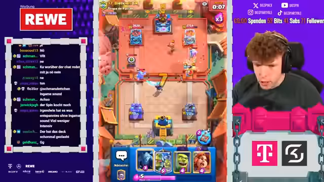 00:59:52Nach einem Misserfolg mit der Deck-Optimierung wechselt der Streamer zu seinem Pay-to-Win-Account in der Bauarbeiterwerkstatt. Das Ziel ist, die Rakete zu maxieren. Nachdem es in mehreren Truhen nicht gefunden wird, kauft der Streamer Juwelen, um die Rakete freischalten und sie dann mit gekauften Joker auf Level 16 zu bringen. Dies führt zu einem Fehlkauf, der 40 Euro auf dem falschen Account verschlingt, bevor er die Rakete endlich erhält.