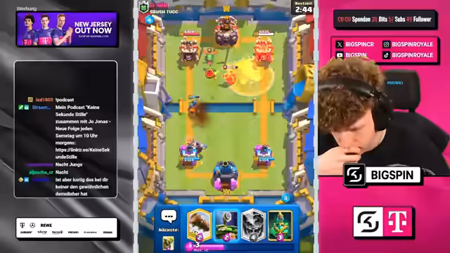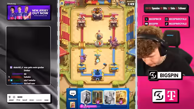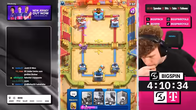 03:04:44In den Anfangsphasen des Streams konzentriert sich der Streamer auf offensive Spielzüge, die jedoch teilweise suboptimal sind und zu Verlusten führen. Er äußert Frustration über den gegnerischen Einsatz von Mega Minion und Walküre und stellt fest, dass sein eigenes Spiel nicht optimal war, was zu einer 1-2 Situation beitrug. Der Fokus liegt auf dem Erkennen und Anpassen an die gegnerischen Decks, wobei die Wahl der Karten wie Eisgeist und Skelette zentral ist, um den Turm zu verteidigen und Druck aufzubauen. Trotz guter Angriffe wie der Sasuke-Kombination, gelingt es nicht, das Spiel zu gewinnen, was zu einem schmerzhaften Verlust führt.