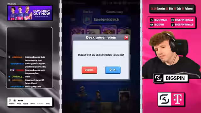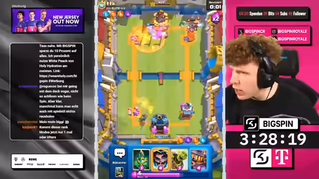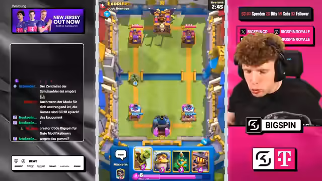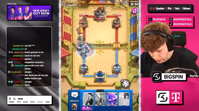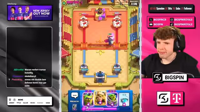 00:58:39Der Stream beginnt mit einem Spiel in Clash Royale, bei dem zwei Spieler Evo Executioner-Decks gegeneinander antreten. Ein weiteres Thema ist die Präsentation eines Decks, das Fledermäuse und andere Truppen kombiniert, um einen starken Anzug zu ermöglichen. Gleichzeitig wird über eine Full-Free-to-Play-Hardcore-Challenge gesprochen, bei der ein Account innerhalb von 100 Stunden auf 16 gebracht und 10.000 Trophäen erreicht werden muss, ansonsten wird der Account gelöscht. Das Gameplay ist anspruchsvoll, und der Gegner wird als sehr gut eingeschätzt, der den Spieler unter Druck setzt.