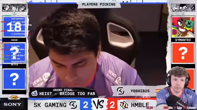 05:47:01Das Finale beginnt mit einem sehr interessanten Draft. SK Gaming wählt als Erster Kit, während Humble mit Meeple, Max und Hank antwortet. Das erste Spiel ist von Anfang an extrem umkämpft und von knappem Aktionen geprägt. SK Gaming geht früh in Führung, doch Humble kämpft sich zurück und gewinnt das Game mit 1-0. Die MVP-Stimmen scheinen sich dabei auf Humble zu konzentrieren, was die Einschätzung unterstreicht.