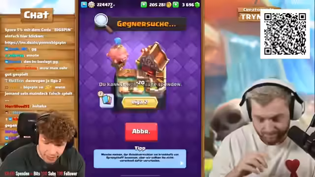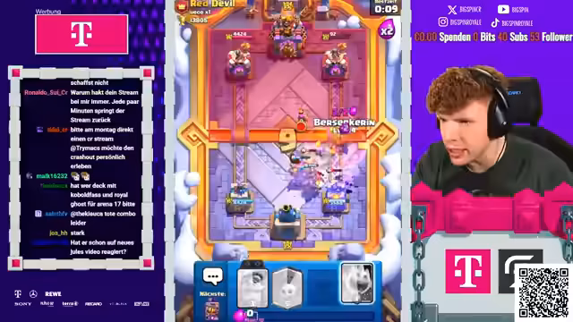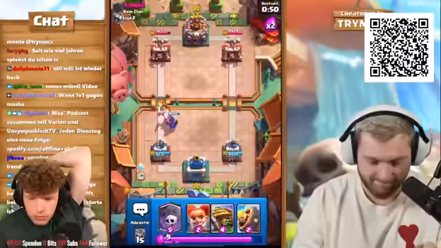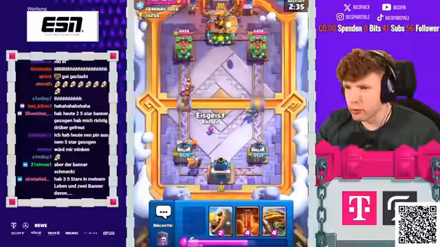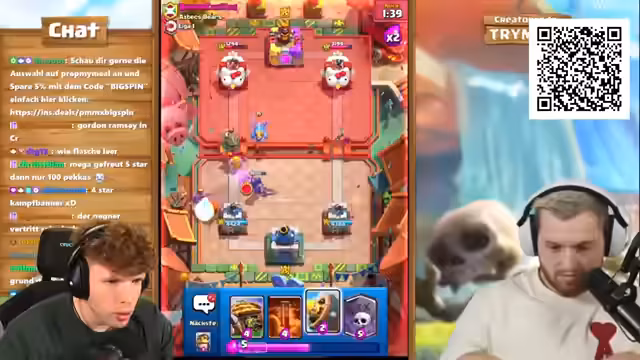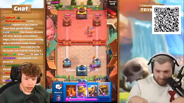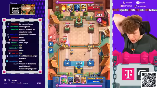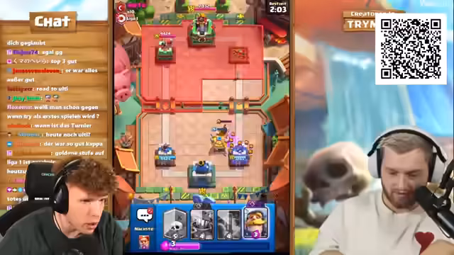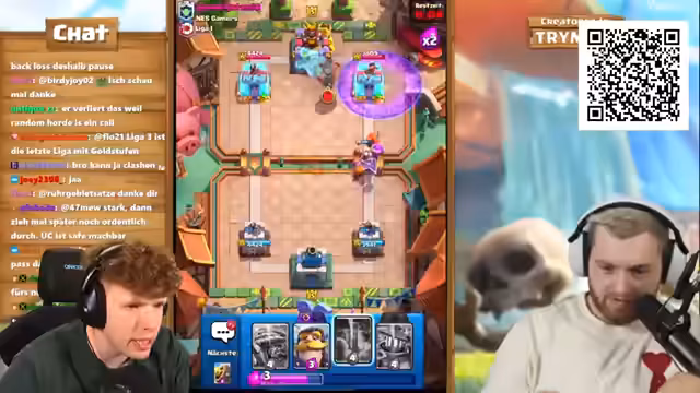 00:12:54Der Streamer bestreitet mehrere Matches in Clash Royale, die sich als äußerst herausfordernd erweisen. Er trifft auf Decks, die sein eigenes Golem-Deck stark kontern, wie zum Beispiel Giant Sparky, Magier und Mini-Pekka oder Lava Clone. Besonders frustrierend sind Interaktionen, bei denen vermeintlich sichere Plays nicht wie erwartet funktionieren oder der Gegner unerwartete Konterkarten spielt. Trotz der Schwierigkeiten versucht er, das Beste aus den Situationen zu machen und analysiert seine Fehler. Parallel dazu bereitet er sich mit Trymacs auf ein Turnier vor, bei dem jedes Team einen zufälligen Helden spielen muss. Ihr Team hat den Giant zugewiesen bekommen, was als drittschlechtester Held empfunden wird, da er leicht zu kontern ist und nicht gut mit Champions harmoniert. Es wird diskutiert, wie man diesen Nachteil ausgleichen kann, insbesondere da andere Teams keine Champions spielen dürfen, während sie selbst einen Champion zusätzlich zum Giant nutzen können.