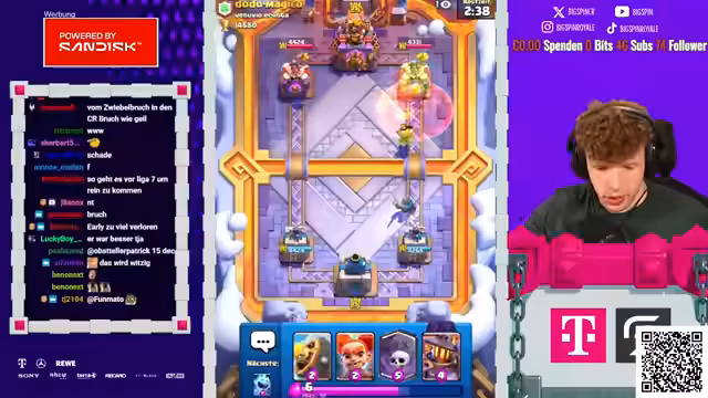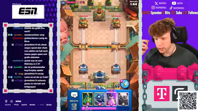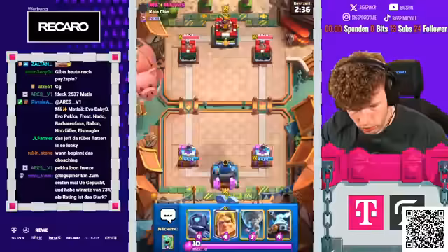 02:40:25Die Spiele in Liga 1 erweisen sich als äußerst intensiv und oft von Fehlern auf beiden Seiten geprägt. Der Spieler gewinnt mehrere Matches, obwohl die Gegner teilweise unerklärliche Züge machen, wie das Werfen von Raketen auf einzelne Truppen oder das Ignorieren von Win Conditions. Die Platzierung von Einheiten wie der Prinzessin und dem Ofen wird kritisch bewertet, da sie oft nicht optimal eingesetzt werden. Die Gegner in Liga 1 werden als „Turboflöte“ oder „größter Buchküllerer“ bezeichnet, was die Frustration über deren Spielweise widerspiegelt. Trotz der Fehler gelingt es dem Spieler, die Spiele für sich zu entscheiden, oft durch den Einsatz des Evo-Ritters und gut getimter Poisons. Die Matches sind so anspruchsvoll, dass sie mit Ultimate Champion Games verglichen werden, was die hohe Intensität unterstreicht.