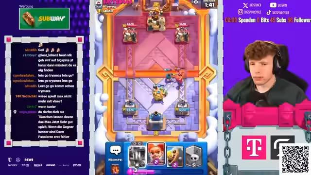 01:33:45Im weiteren Verlauf des Streams stehen die Spieler vor neuen Herausforderungen und müssen ihre Strategien anpassen. Gegen einen Gegner mit einem Cycle-Deck und einem Level 16 Schweinereiter auf einem Level 15 Turm wird eine defensive Spielweise mit Ofen und Hütte empfohlen, um den Druck zu kontrollieren. Die Wichtigkeit, den Evo-Ritter effektiv einzusetzen und den Gegner mit Graveyard unter Druck zu setzen, wird betont. Die Spieler erkennen, dass die gegnerischen Skami-Einheiten aufgrund der eigenen überlevelten Karten nutzlos sind, was einen erheblichen Vorteil darstellt. Trotz einiger Missverständnisse und Fehlkommunikation zwischen den Spielern, insbesondere bei der Platzierung von Barrels und Rittern, gelingt es ihnen, die Spiele zu gewinnen. Die Diskussion über die DPS von Berserkerin und Ritter zeigt die Detailverliebtheit in der Analyse der Kartenwerte. Die Spieler sind nur noch ein Spiel vom Erreichen ihres Ziels entfernt, was die Spannung und den Fokus erhöht. Die Notwendigkeit, auch gegen nervige Gegnerdecks wie Ballon auf Level 16 eine klare Strategie zu verfolgen und die eigenen Karten optimal einzusetzen, wird deutlich. Die Spieler sind entschlossen, die letzten Siege zu erringen und ihre Ziele zu erreichen, auch wenn der Weg dorthin manchmal durch unerwartete Schwierigkeiten geprägt ist.