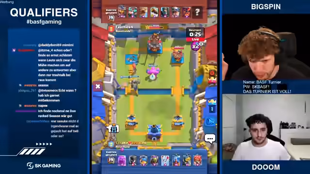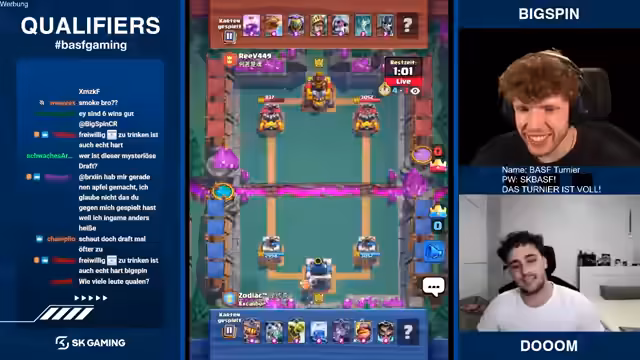 01:00:11Der Streamer kündigt ein MEGA Auswahl-Zuschauer-Turnier um 21 Uhr an, das von BASF gesponsert wird. Als Hauptpreis für den ersten Platz sind 150 Euro ausgeschrieben. Zusätzlich werden diverse Merchandise-Artikel wie ein Hoodie, eine Supercell-Statue und ein SK-Merchandise verlost. Die Plätze eins bis drei erhalten den Pass Royal. Der Streamer betont, dass es sich um ein entspanntes Event handeln soll und er die Steuer für den Hauptpreis übernimmt.