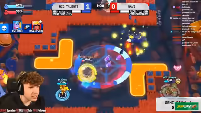 03:13:52Das zweite Set zwischen Big Talents und Navi beginnt mit einem spannenden Brawl Ball Match. Beide Teams liegen 1:1, und das Game verläuft auf sehr hohem Niveau. Kommentare heben die starken Einzelleistungen der Brawler hervor, besonders von Pierce, der im Early Game viel Einfluss hat. Die Ausführungen umfassen die Taktiken, die Vor- und Nachteile der gewählten Brawler in der Orbital und die spannungsgeladenen Szenen.