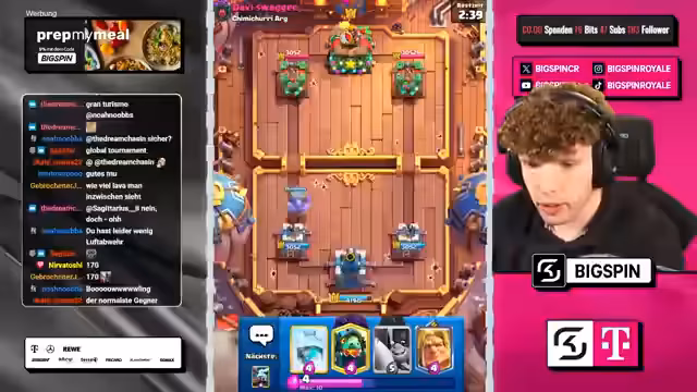 05:00:43Nach dem Ende des Brawl Stars Manfleet-Finales wechselt der Stream zu Clash Royale, genauer gesagt zum Global Turnier. Es werden verschiedene Decks analysiert, wie z.B. Graveyard-Eis-Golem-Freeze-Bowler-Nado oder Mega Ritter Graveyard. Der Streamer entscheidet sich für ein Deck mit Artgenossen und Aimcare Cracker. Er beginnt in das GT einzusteigen und beschreibt die Matches als anspruchsvoll, wobei die Gegner oft sehr stark sind. Es kommt zu mehreren Siegen, aber auch zu knappen und teils frustrierenden Niederlagen gegen Decks wie Mega Ritter und Cracker.