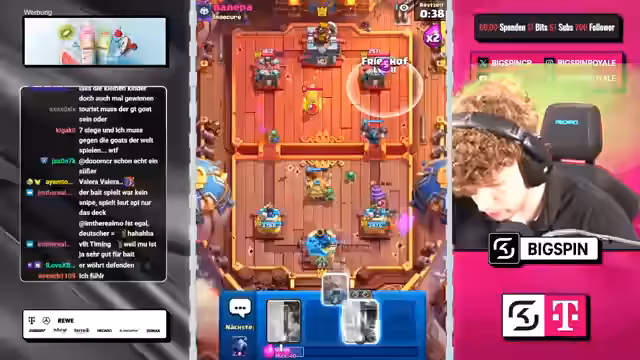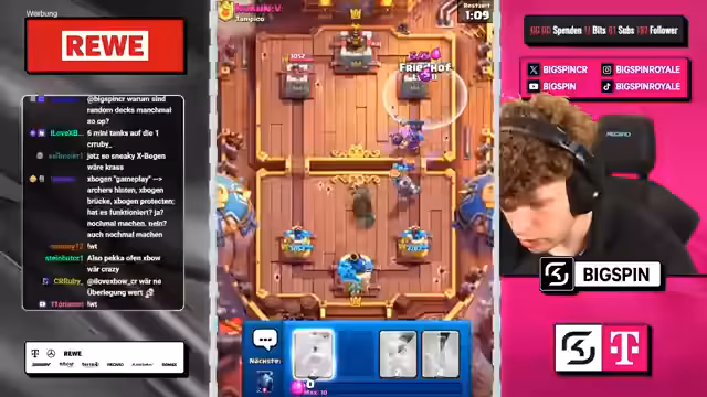 07:22:44Der Streamer zeigt große Frustration über die aktuelle Meta, insbesondere gegenüber dem X-Bogen-Deck. Er fühlt sich von dieser Karte zu oft konfrontiert und empfindet sie als unfair, unabhängig von ihrem Skill-Level. Im Gegensatz dazu prahlt er mit seinem 'Goated-Deck', das aus seiner Sicht perfekt gegen X-Bogen ist. Er spricht mehrfach über ein Spiel, in dem er den Gegner mit seiner Walze-Strategie plattmachen wollte, während er auch seine eigene suboptimale Spielweise in einem anderen Match kritisiert, bei dem er wusste, was zu tun war, es aber nicht getan hat.