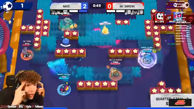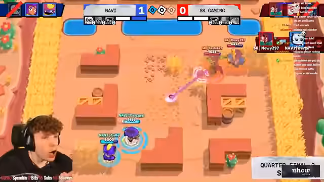 01:12:19Beim dritten Spiel im Brawl Ball Modus auf der Map Sneaky Fields kritisierte der Streamer den Draft von SK stark. SK wählte Kit, Mac und Sandy, was im Chat als 'tot' bezeichnet wurde. Navi hingegen mit Shade, Crow und Gale hatte einen deutlich besseren Draft. Trotz einer guten Startphase von SK gelang es Navi, den Ball zu kontrollieren und durch effektive Kombinationen und Schadensausbringung die Oberhand zu behalten. SKs Nachlässigkeit und fehlender Follow-Up Schaden führten letztlich zum klaren Sieg von Navi.