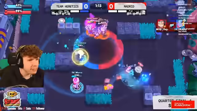 02:10:45Das Match verläuft extrem ausgeglichen und wird vom Kommentator als sehr spannend beschrieben. Beide Teams agieren nervös und unperfekt. Trotzdem gelingen Kills auf beiden Seiten, wie beispielsweise durch Mortar und Hypercharge. Madrid zeigt mit dem Brawler Penny Mortar unerwartet starke Performance und holt dabei Prozente während der Kämpfe, was sich als entscheidender Vorteil herausstellt. Nach einem verpassten Takedown durch Heretics gewinnt Madrid die erste Map knapp mit 1 zu 0.