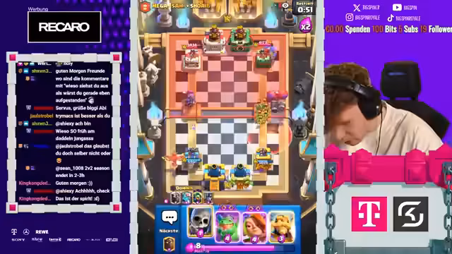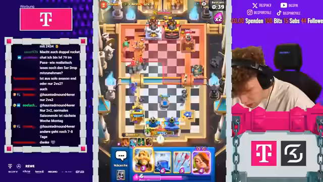 00:05:26Während des Streams werden die Decks der Gegner kontinuierlich analysiert. Der Streamer identifiziert starke Karten wie Henker, Valkyrie und Golem und passt seine Taktik an. Er diskutiert mit seinem Partner die Stärken und Schwächen der gegnerischen Formationen und versucht, deren Spielmuster durch geschicktes Card Placement und spielerische Feinheiten zu durchbrechen, um Vorteile zu erzielen.
