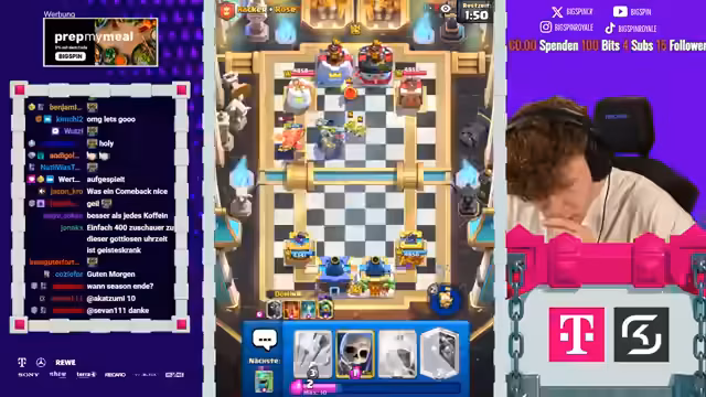 02:01:27Das Spielverlauf ist von schnellen Wechseln geprägt. Mal wird ein scheinbar sicherer Sieg gefeiert, doch im nächsten Moment droht eine Niederlage. Der Streamer äußert seine Verärgerung über Gegnerzüge, die er als 'scheiße' oder 'krass' bezeichnet. Besonders der Umgang mit gegnerischen Karten wie 'Cracker' und die Verteidigung gegen den gegnerischen Königsturm werden zur zentralen Herausforderung, die schnelle und klare Reaktionen erfordert.