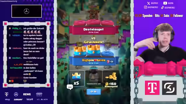 00:00:06Der Stream startet pünktlich mit einigen anfänglichen Diskussionen über den Titel und Kommentare von Zuschauern. BigSpin äußert sich amüsiert über unerwartete Titeländerungen und begrüßt die Zuschauer. Er erklärt, dass er vor dem Stream noch im Fitnessstudio war, um sich auf die 'Psychosen in Clash Royale' vorzubereiten. Es wird über bevorstehende Inhalte gesprochen, darunter das Testen eines neuen Decks und der Eintritt ins globale Turnier (GT). Er erwähnt Protein-Linsen-Chips als seinen Snack für den Stream. Abschließend gratuliert er einem Zuschauer zum bevorstehenden Geburtstag und spricht kurz über das Beef-Video, welches sehr erfolgreich war.