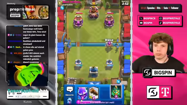 02:30:09Ein Community-Mitglied bittet um eine Erklärung des als "OP" (Overpowered) geltenden Decks. Der Streamer beschreibt die Kernkomponenten: Giant, Elektrogeist, Eisgeist, Lock und Poison. Die Strategie besteht darin, günstige Karten wie Lock und Poison zu spielen, um schnell in den Spielfluss zu kommen und auf die starken Epischen Augments wie E-Bus oder die Barbarenhütte zu warten, um dann zu gewinnen. Gleichzeitig nutzt er die Zeit, um im Battle Pass weitere Helden wie den Mega-Lakai freizuschalten.