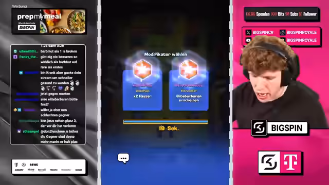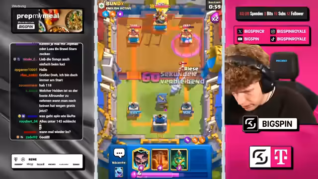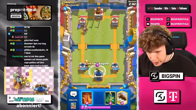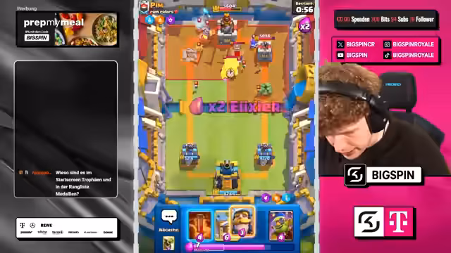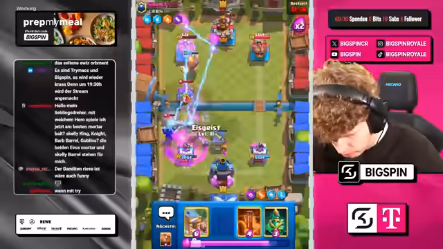 00:00:32Der Stream beginnt mit der Ankündigung des Chaos-Modus in Clash Royale. Der Streamer begrüßt die Zuschauer und gibt an, dass jeder einen kostenlosen Helden im neuen Update erhält. Er kündigt an, mit einem populären Deck, dem FS Never Die Copypasta, im Chaos-Ladder anzutreten. Die Hauptstrategie im Spiel wird der Einsatz von Elektrogeist und Gift sein, um gegen beliebige Meta-Decks bestehen zu können.