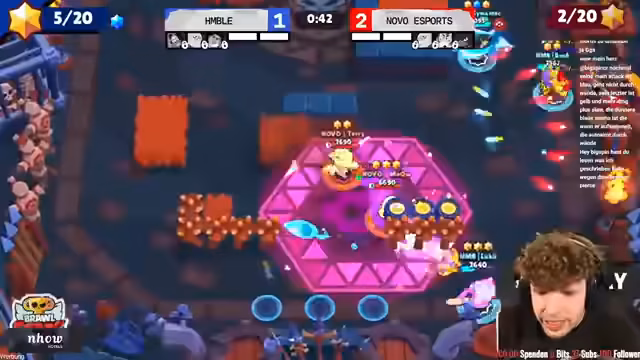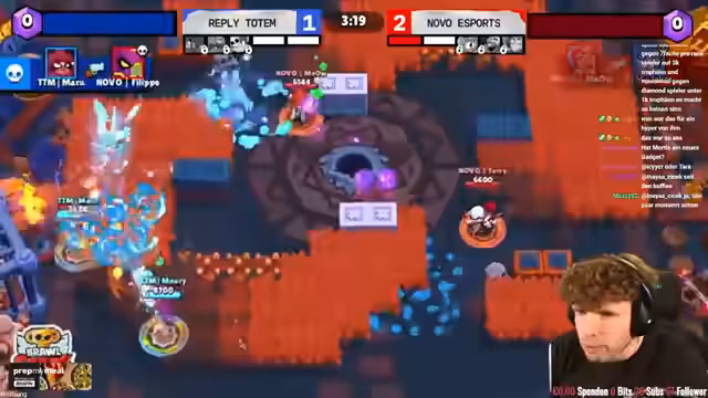 02:36:59Das Match beginnt mit einem turbulenten Duell zwischen den Teams Totem und Novo in einem 2-gegen-1-Szenario, wobei Totem das erste Spiel klar mit 1-0 für sich entscheiden kann. Im Folgespiel wird die Dynamik jedoch gedreht; Novo spielt extrem aggressiv und wendet die Mobility ihrer Brawler klug an, um Druck aufzubauen. Trotz eines starken Auftretens von Totem ist Novo in der Lage, die Partie zu kontrollieren, einen Bluestar zu erobern und die Spielstände auf 2-0 zu erhöhen. Die hohen Einschätzungszahlen der Zuschauer zugunsten von Totem scheinen sich nicht zu bewahrheiten, da Novo eine sensationelle Leistung zeigt.
