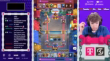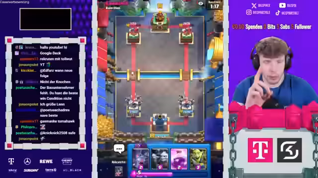 00:02:04Nach der Gründung des Clans werden die ersten Zuschauer-Decks gespielt. Das erste Deck von 'TNT Royal' wird als unkonventionell und stark auf Spam-Taktiken ausgelegt beschrieben. Der Streamer analysiert das Deck scharf und sieht trotz der eigenwilligen Kombination aus Skeletten und TNT-Rekruten Siegchancen, da der Gegner eine ähnliche, aber schwächere Taktik spielt.