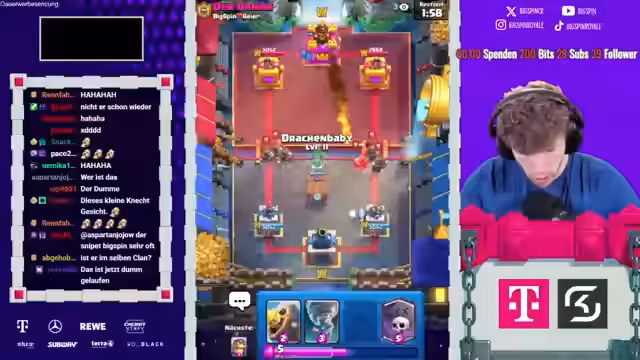 01:29:23Nach einer Reihe von Rückschlägen wechselt der Streamer das Deck und findet in einem Lockbait-Deck mit Sparky und Valkyro einen Durchbruch. Er kombiniert geschickt verschiedene Karten und nutzt eine Archer-Queen, um den Turm des Gegners zu zerstören. Der Sieg ist ihm wichtig, da er das Deck als 'absoluten Philos' bezeichnet. Anschließend stellt er ein weiteres, von einem Zuschauer vorgeschlagenes Deck vor, das er jedoch als 'Troll-Deck' ablehnt. Der Fokus liegt nun auf einer neuen Strategie mit dem 'Dummen'-Deck, bei dem er den Gegner mit gezielten Zügen wie Baby Dragon und Ritter unter Druck setzt und erfolgreich verteidigt.