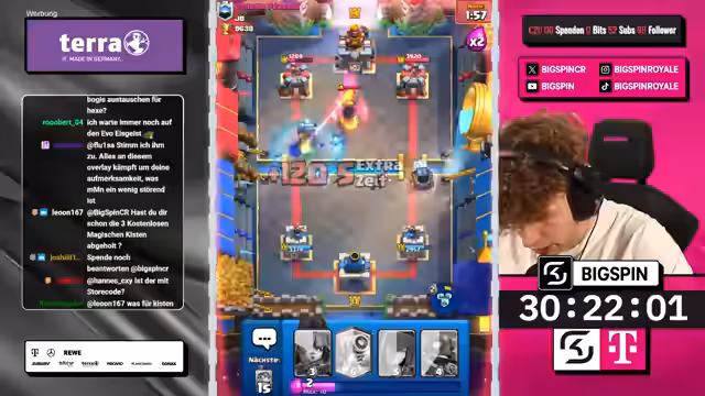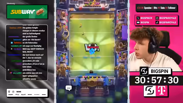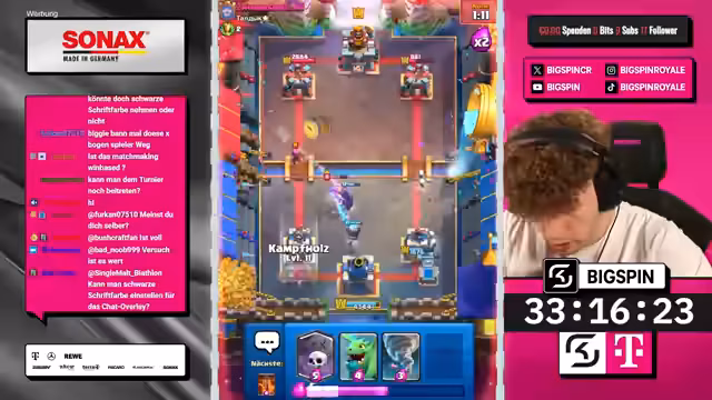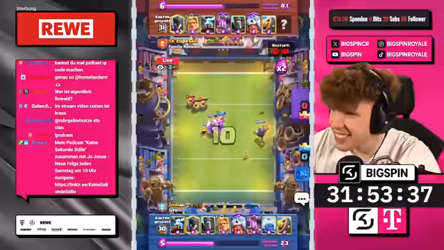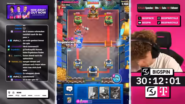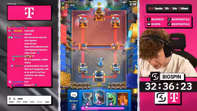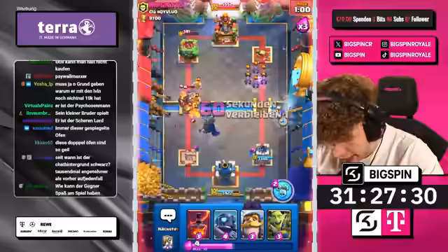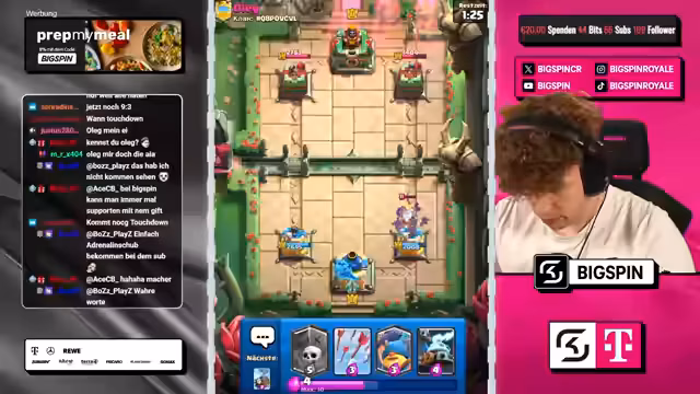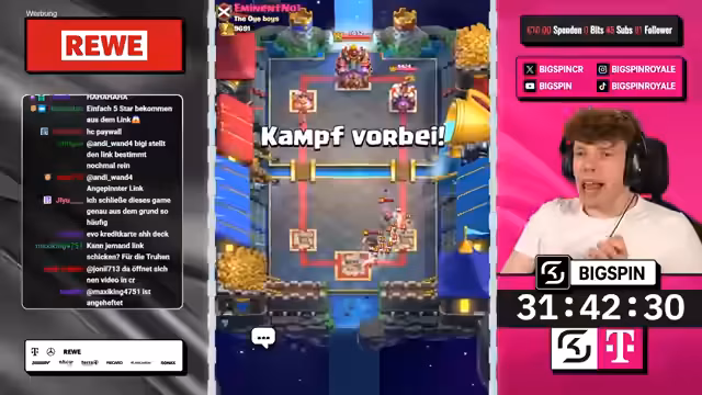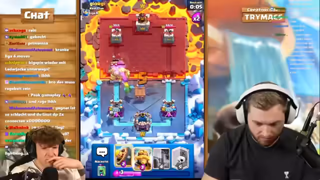 04:50:25Der Streamer nutzt einen Split mit Goblin Gang, um Druck auf beide Lanes auszuüben, während der Gegner defensiv reagiert und mit einem Wilden Henker einen verschwendeten Zug macht. Durch die Kombination aus Hexe, Minipacker und Ritter schafft der Streamer einen massiven Schaden am gegnerischen Turm. Trotz eines Engagements des Gegners mit einem zweiten Meganischen Ritter wird das Spiel durch eine geschickte Zündung mit leeren Zauber für einen Dreikronen-Sieg entschieden und die Trophäen stabilisiert.