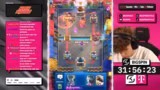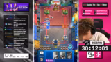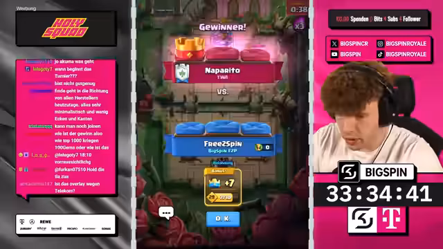 00:30:13Die Preisverteilung für das Turnier wird bekannt gegeben: Top 1.000 Teilnehmer erhalten 1.000 Gems, Top 100 sogar 2.000 Gems. Das ambitionierte Ziel des Streamers ist der Einzug in die Top 100. Im Verlauf des Turniers gelingt es ihm, sich nach oben zu kämpfen und eine Position im Bereich der 140 bis 200 Plätze zu halten. Nach mehreren Siegen und Niederlagen, oft aufgrund von technischen Vorteilen oder Nachteilen, schafft er es, auf 9 Siege zu kommen, was ein guter Fortschritt im Wettbewerb darstellt.